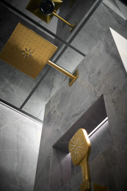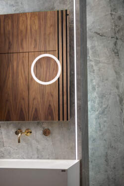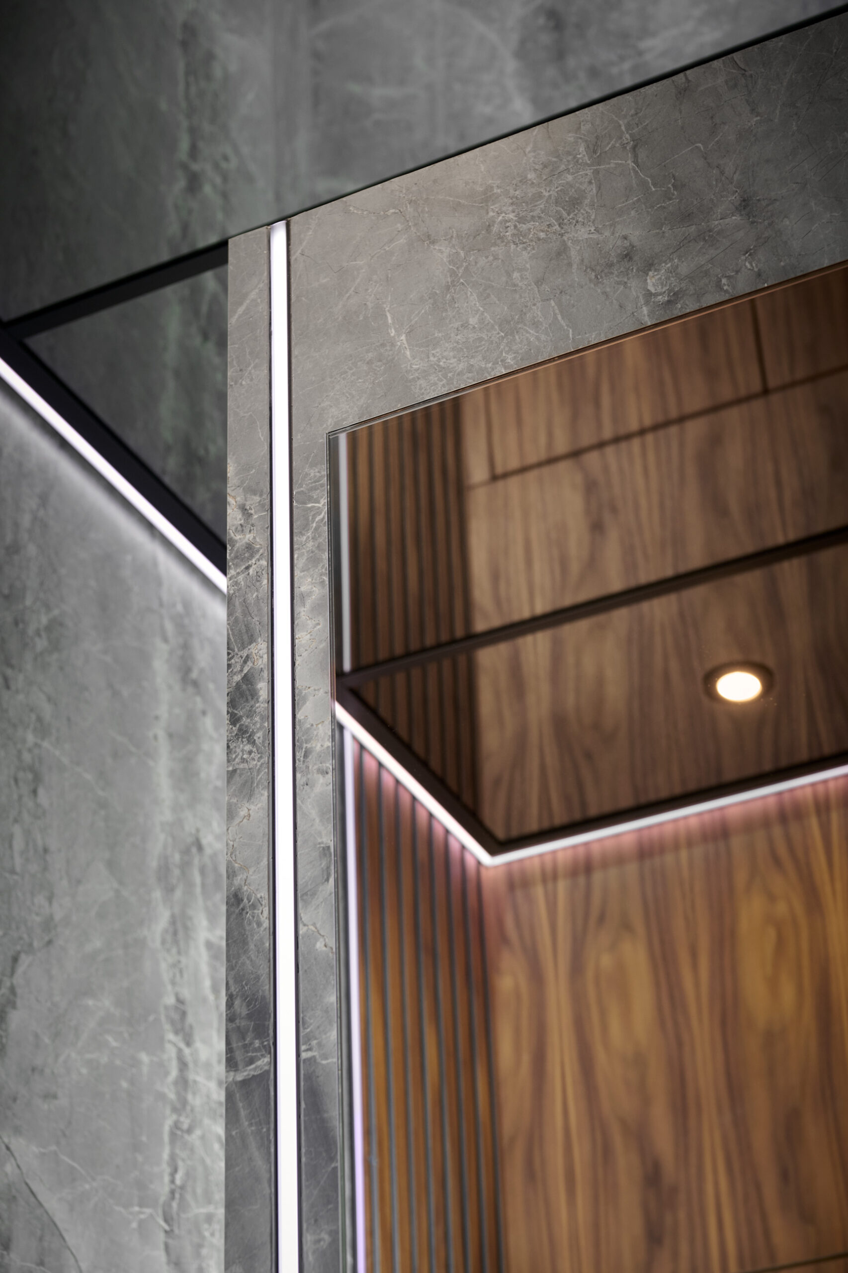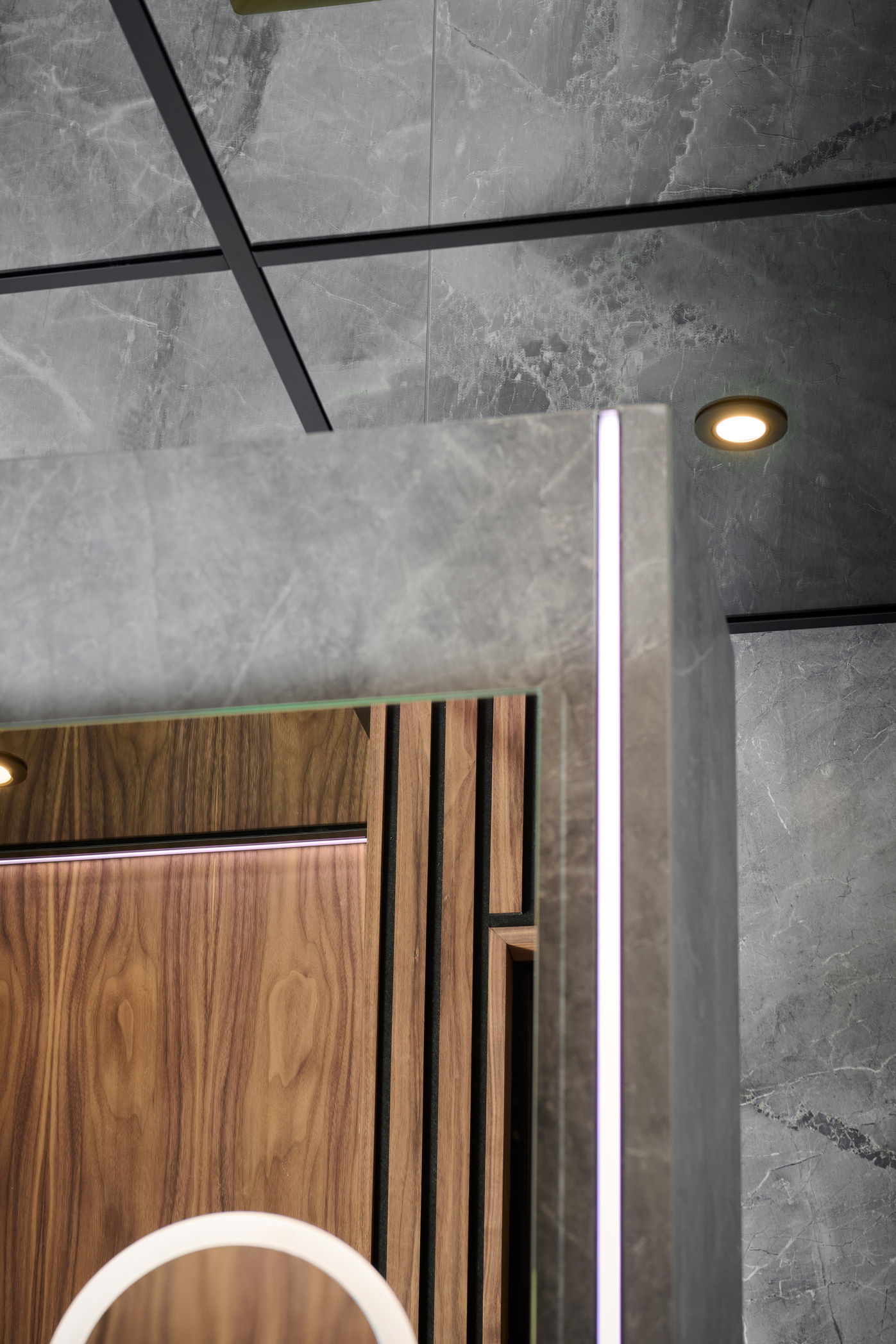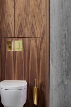 Totalrenoveret et gæstebadeværelse i en villa med keramiske fliser på gulv og vægge. For at skabe en følelse af større rum er der installeret et røget spejl i loftet samt valnøddelameller og væg med indbygget LED-lys. Der er også tilføjet en shampoo-niche med lys i bruseafdelingen, og der er skabt et skjult skab over toilettet. Kunden ønskede stemningsfuld belysning med LED-lys i inventaret og rummet. Projektet kombinerer funktionalitet med æstetisk elegance for en opgraderet badeværelsesoplevelse.