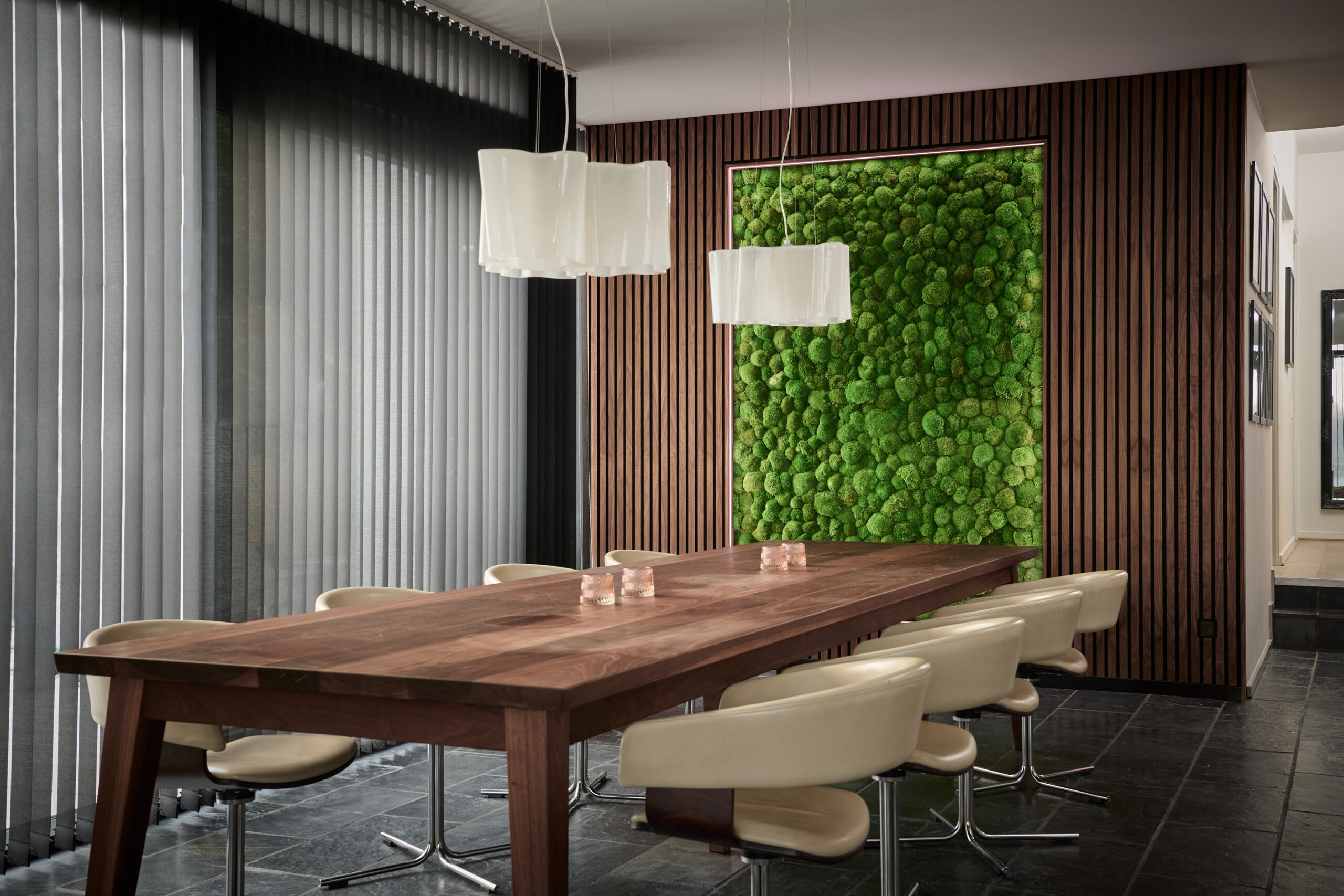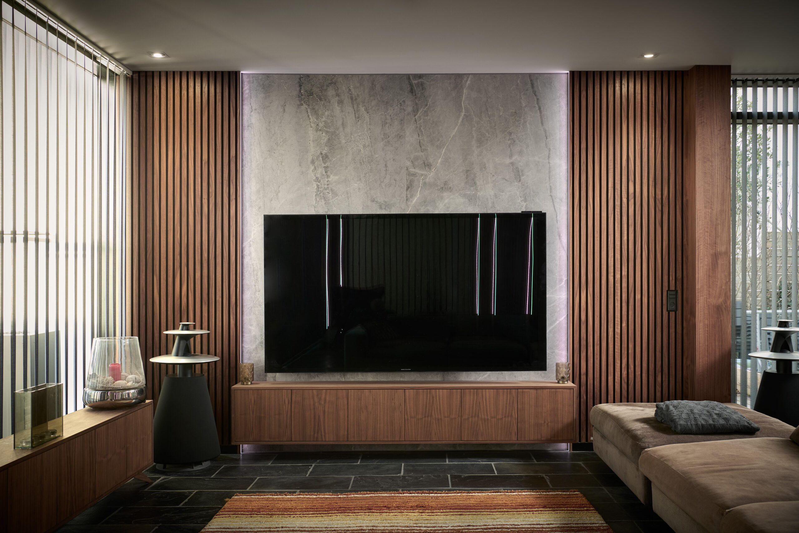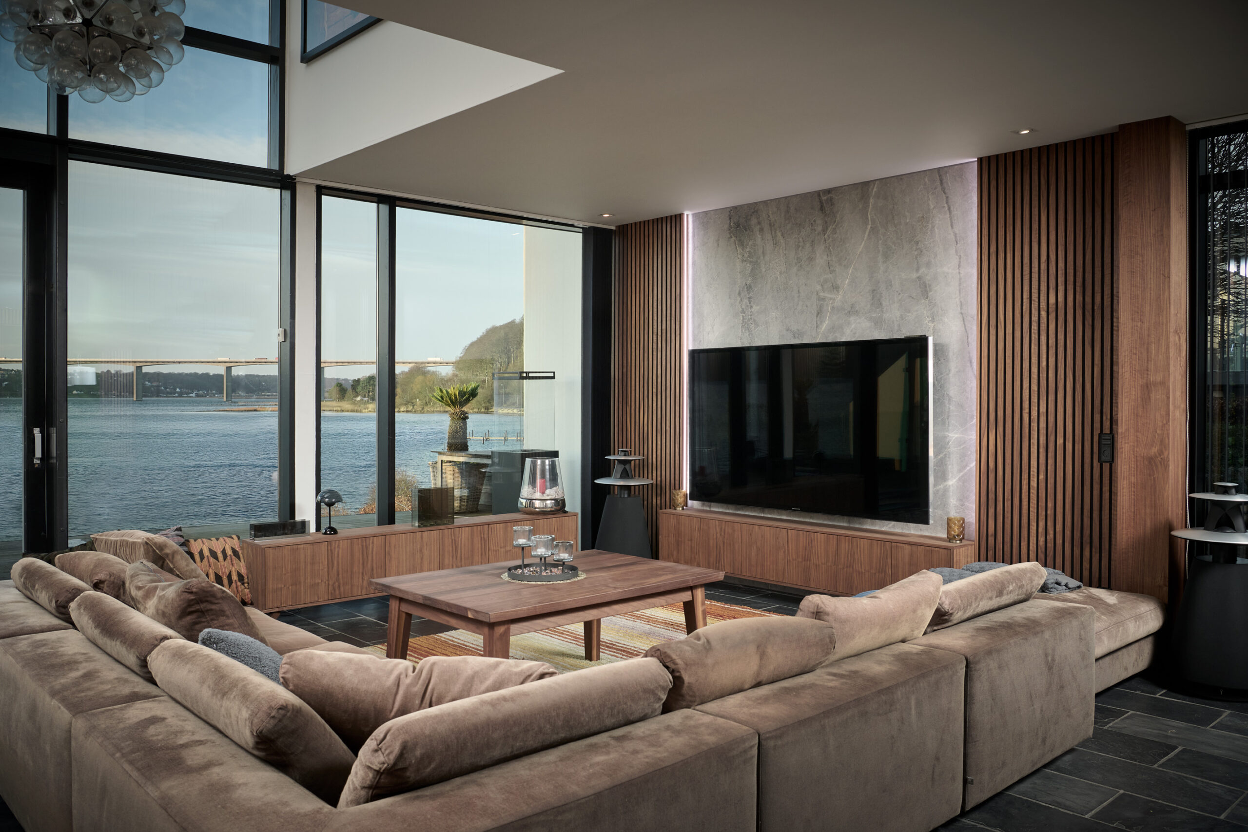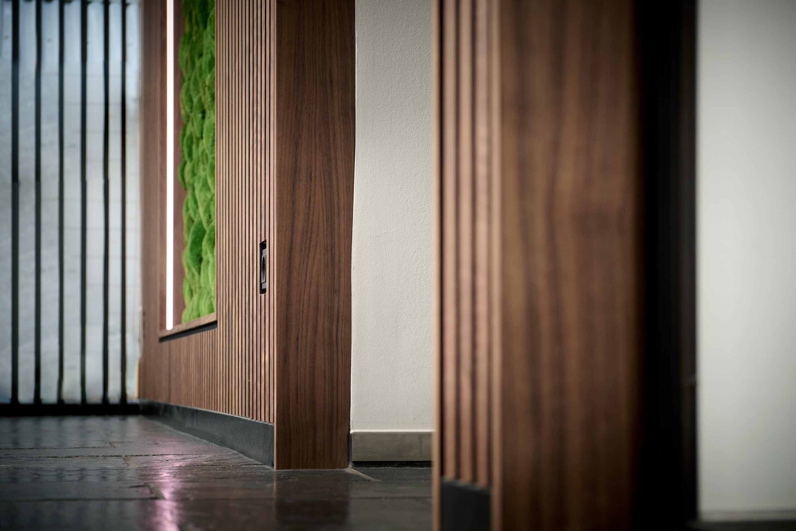 Kunden ønskede en unik opgradering af stuen, som inkluderede en mosvæg kombineret med valnødslameller og LED-belysning. Designet fremhæver mosvæggen i centrum, skabt for at tilføje en naturlig og moderne touch. Et specialdesignet spisebord på 4 meter er blevet integreret i rummet for at imødekomme kundens behov. I et tidligere spildt hjørne af stuen er der tilføjet et barområde med et højbord og barstole; både bordet og væggen bagved, der også er beklædt med valnødslameller og LED-lys, er specialdesignet for at skabe en stemningsfuld atmosfære. TV-væggen er en kombination af keramiske fliser og valnødslameller med LED-belysning samt et specialdesignet TV-møbel. Desuden rådgav vi om placeringen af vinskabe under trappen ved hovedindgangen, hvor et specialdesignet møbel nu passer perfekt.
