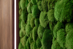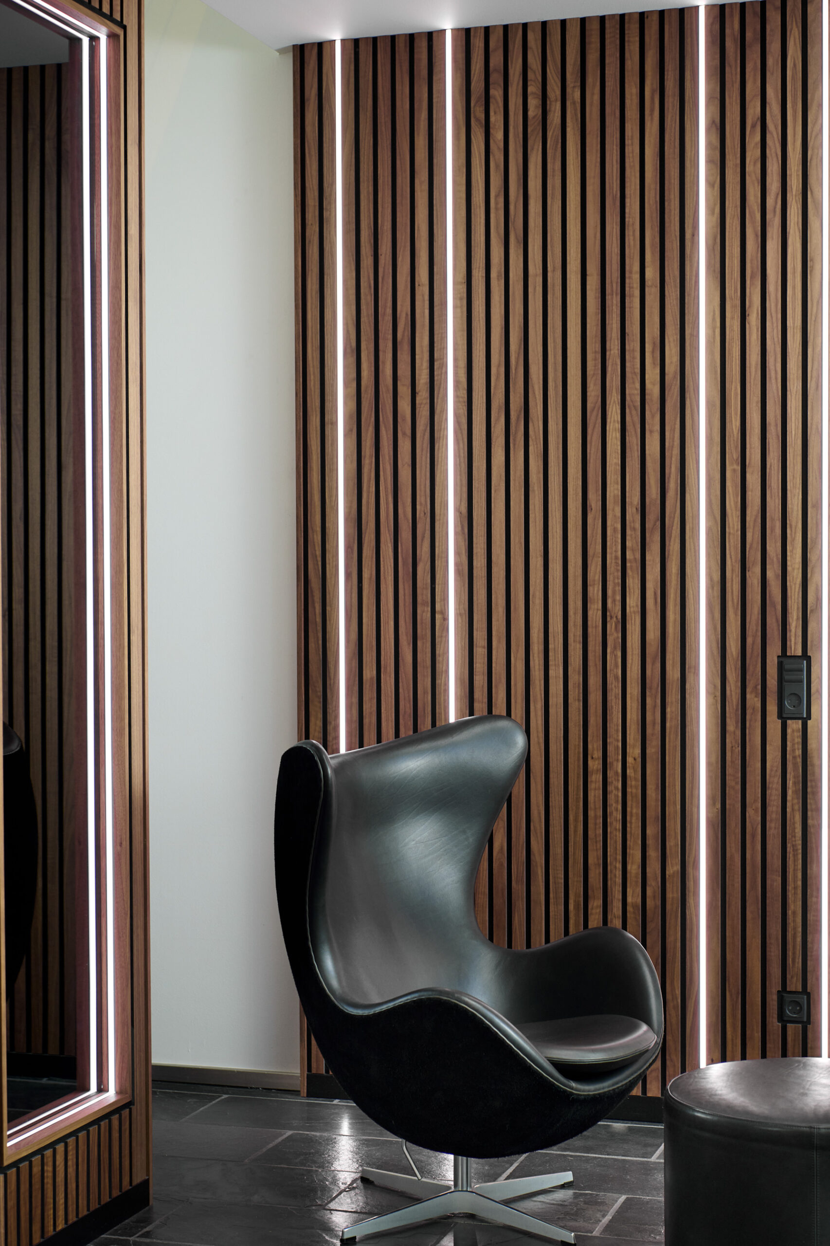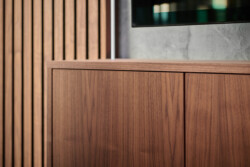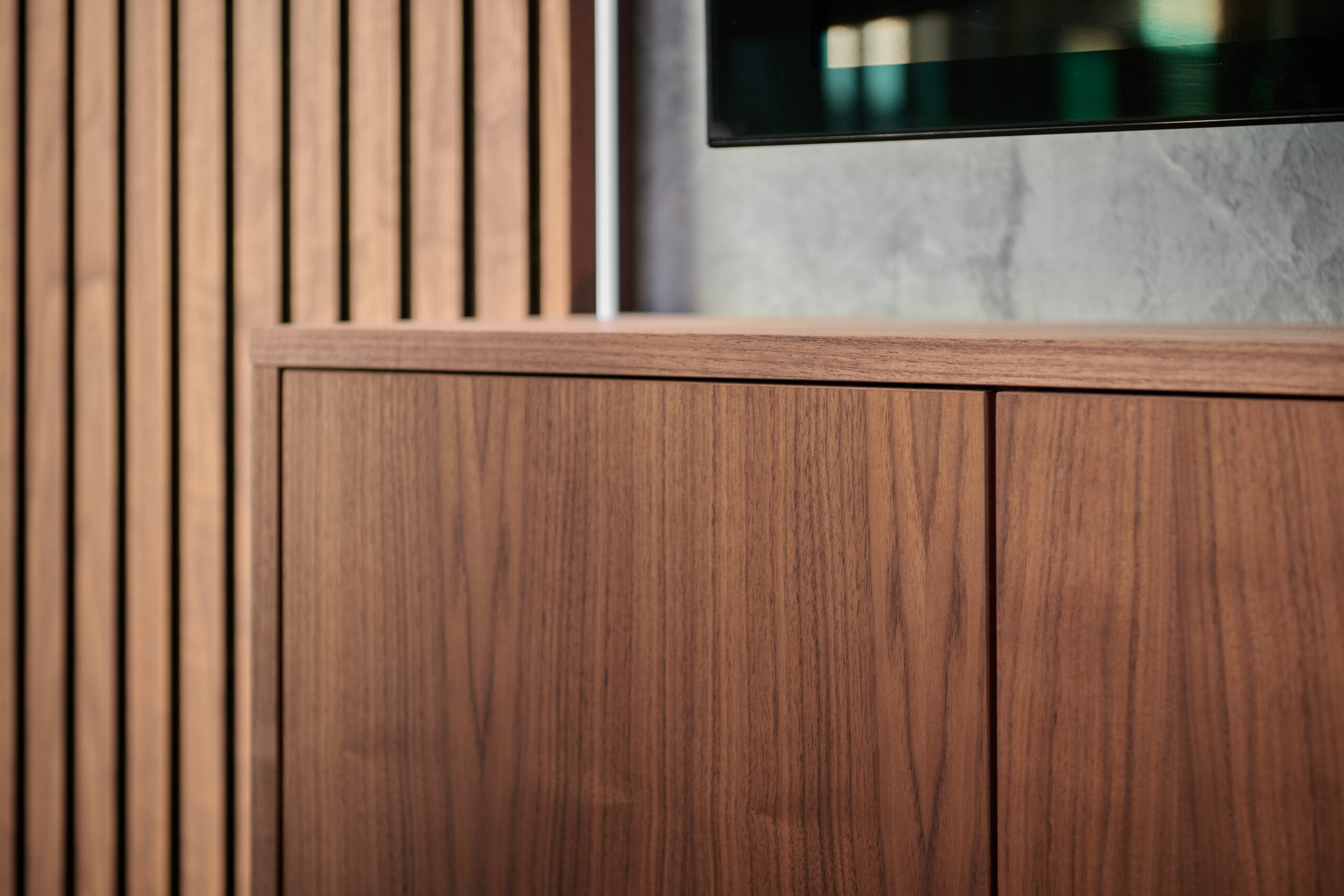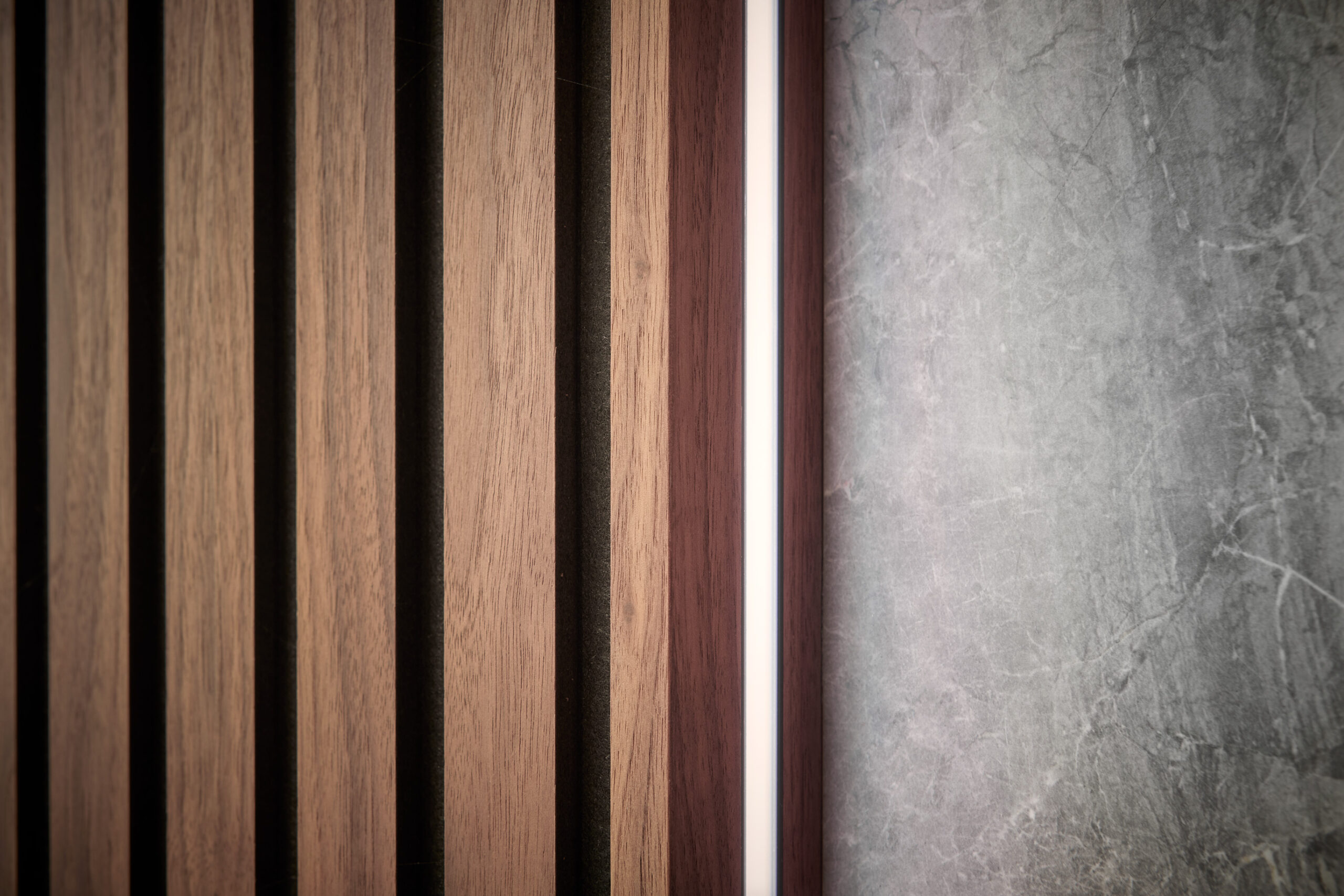 Kunden ønskede en unik opgradering af stuen, som inkluderede en mosvæg kombineret med valnødslameller og LED-belysning. Designet fremhæver mosvæggen i centrum, skabt for at tilføje en naturlig og moderne touch. Et specialdesignet spisebord på 4 meter er blevet integreret i rummet for at imødekomme kundens behov. I et tidligere spildt hjørne af stuen er der tilføjet et barområde med et højbord og barstole; både bordet og væggen bagved, der også er beklædt med valnødslameller og LED-lys, er specialdesignet for at skabe en stemningsfuld atmosfære. TV-væggen er en kombination af keramiske fliser og valnødslameller med LED-belysning samt et specialdesignet TV-møbel. Desuden rådgav vi om placeringen af vinskabe under trappen ved hovedindgangen, hvor et specialdesignet møbel nu passer perfekt.